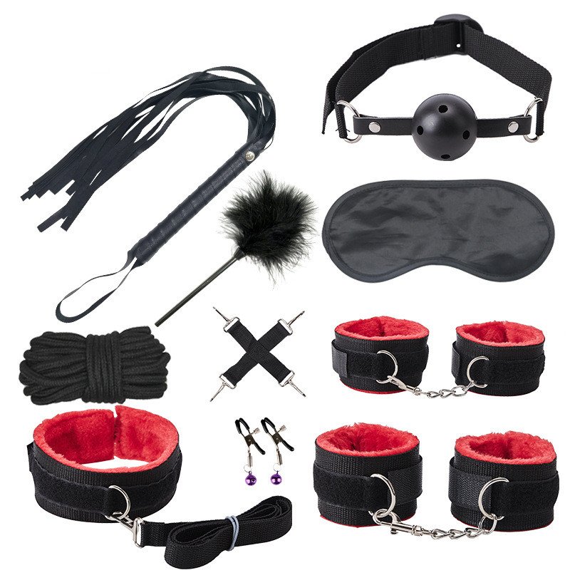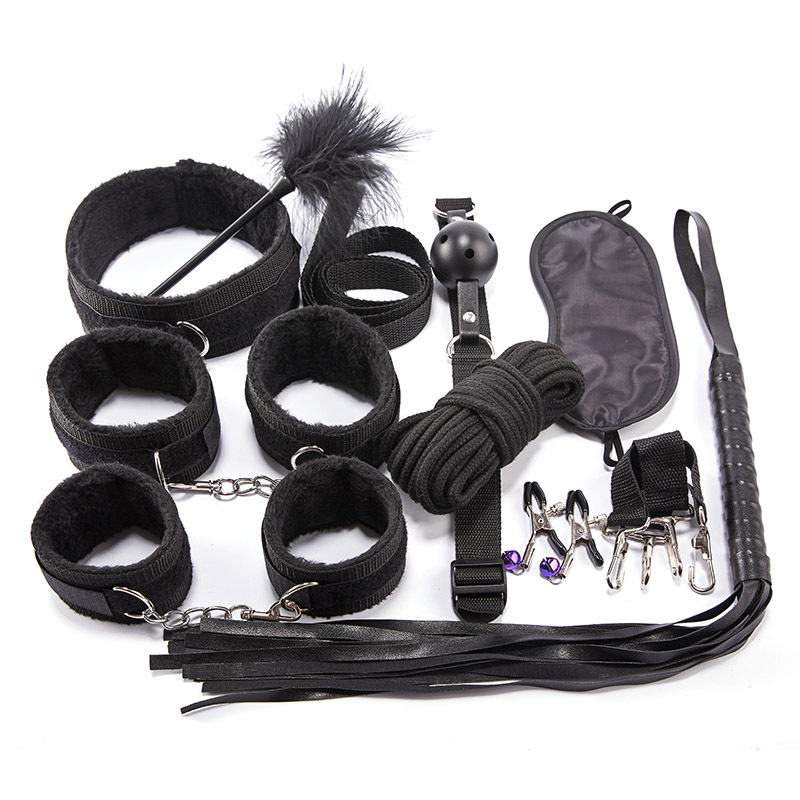 Eye mask*1 Mouth plug*1 Handcuffs*1 Anklet*1 Leather whip*1 Neck cover*1 Cotton rope*1 Feather beat *1 Cross buckle*1 Breast clip*1(pair)